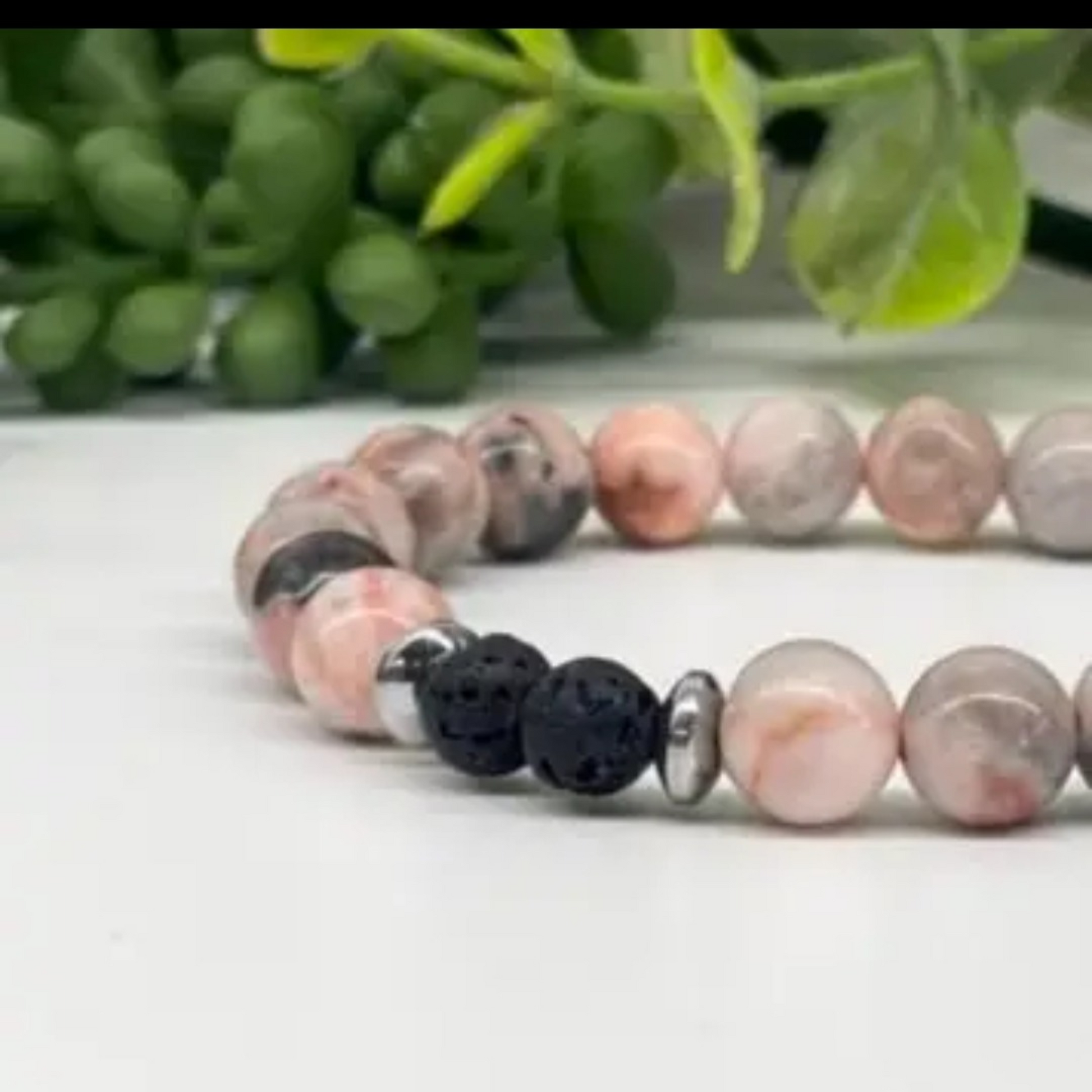 The striking combination of soft pink zebra jasper with the textured black lava stones creates an eye-catching, grounding accessory. The porous black lava stones also serve as a natural diffuser—just add a few drops of your favorite essential oil for long-lasting aromatherapy benefits. Ideal for those who appreciate style, wellness, and quality craftsmanship.